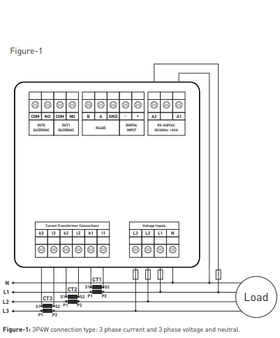 • Displays the phase-to-neutral, phase-to-phase voltage (V) and current (I) values ​​of each phase, with measurement frequency.