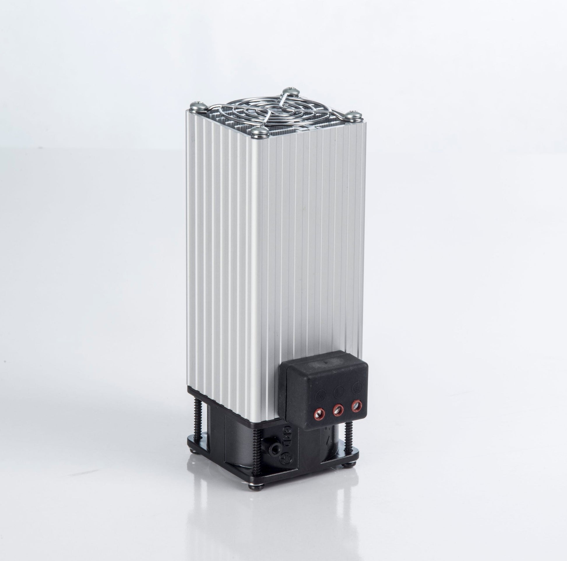 Electric (PTC Body Heater, post-tension heater) switchboard with heating fan, anodized aluminum heat sink and overcurrent protection, DIN rail mountable 100 watts, 220/230 volts AC, PFHT100, Plastim - made in Turkey.