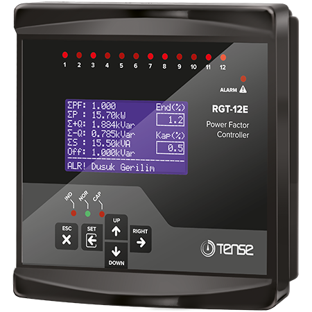 The RGT-12E reactive power regulator (TENSE ) is a fully automatic device for optimal switching of compensation stages.