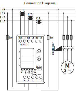A készülék bekapcsolásakor: A TRM-300 sorozatú elektronikus áramrelét úgy tervezték, hogy automatikusan lekapcsolja a készülékeket, amikor a megengedett maximális áramot túllépi. Visszaállítási módok: - Kézi üzemmód: A készüléket a Reset gomb megnyomásával kell visszaállítani. Megjegyzés: Az üzemmódváltáshoz tartsa lenyomva a SELECT gombot 10 másodpercig. Az üzemmódváltáskor a megfelelő LED kijelző kigyullad. Aszimmetria 50% (rögzített) Ha a legnagyobb és a legkisebb fázisáram közötti különbség meghaladja az 50%-ot, a készülék 2 másodpercen belül aszimmetria hiba üzemmódba lép. Aszimmetriahiba esetén: Műszaki paraméterek: - Működési feszültség: 150-260 V AC