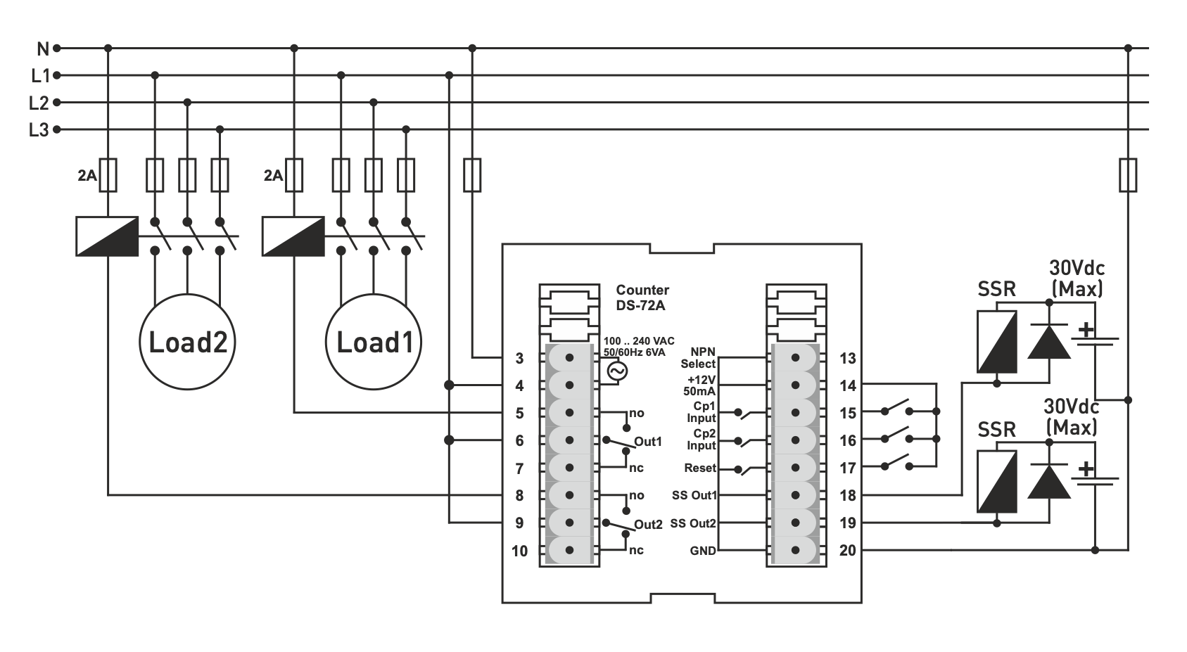 Részletes leírás A DS-72A impulzusszámláló általános specifikációja: 2x 6 számjegyű kijelző, 2x PRESET érték, 2x OUT kimeneti relé, 2x SSout SSR relé vezérléséhez.