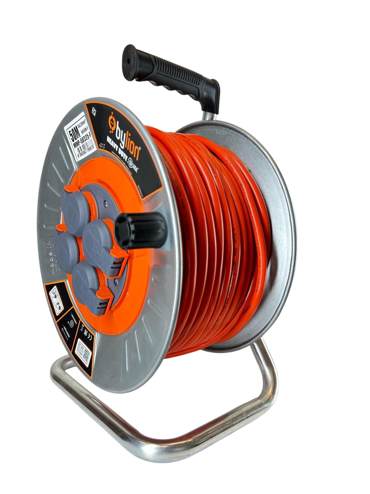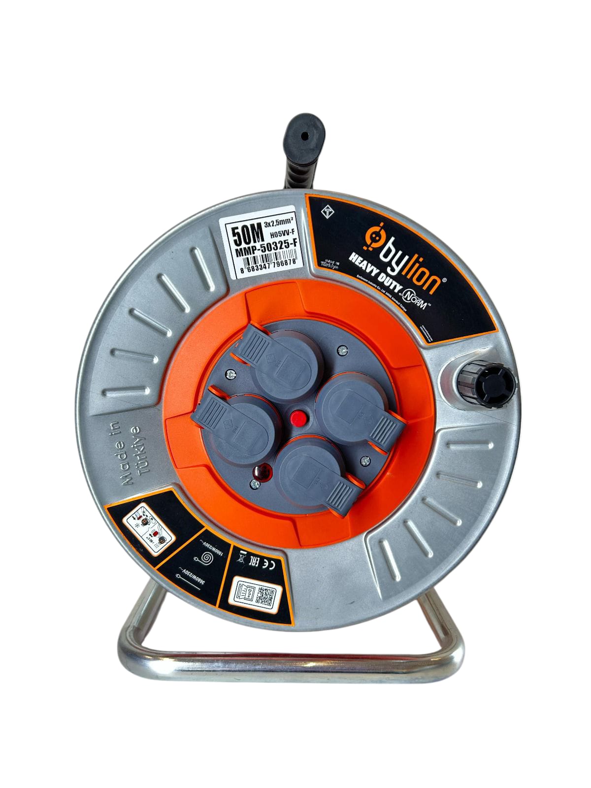 Professzionális fém csörlő rézkábellel 3x2,5 mm2, IP44 túlterhelés elleni védelemmel, 16 A áram francia típus 4 aljzattal, 50 m hosszú, kábel színe: narancssárga.