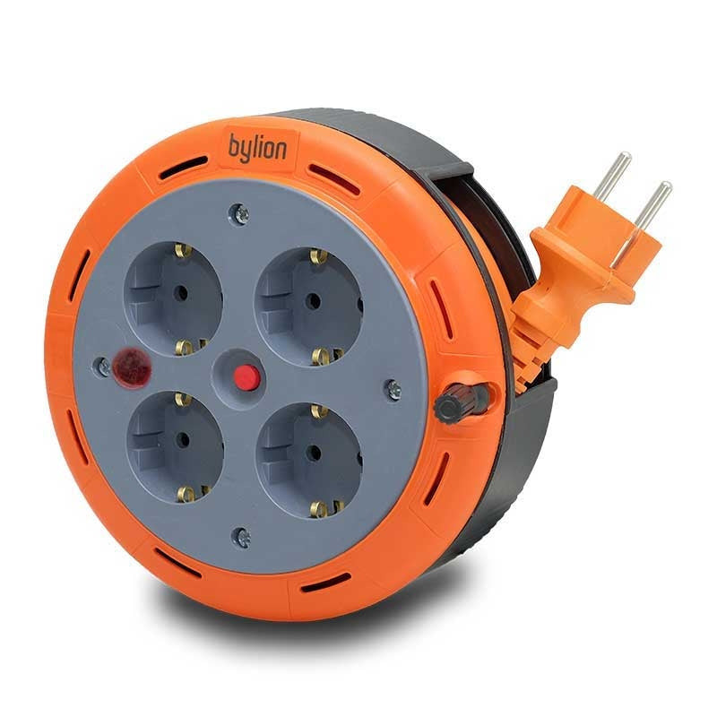 Kompakt kazettás görgős hosszabbítókábel, 5m kábel 4 aljzattal IP20 + hőbiztosíték + gyermekbiztosíték, 3x1mm2, francia típusú (tűs), PHE-05310-E