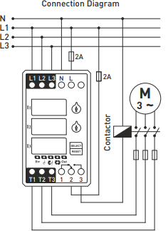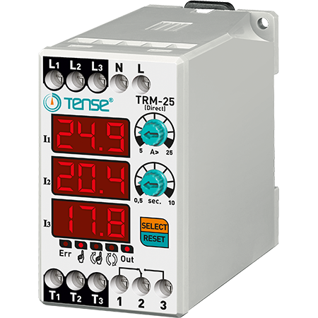 Közvetlen digitális terhelési relé 3×3 számjegyű LED kijelzővel, 3 fázisú, időzítővel, 0,1-25 A tartományban, gyártó TENSE (Törökország) A digitális termikus relék a nagy áram által okozott terhelések károsodásának megelőzésére és ellenőrzésére szolgálnak. - 0,1-25 A (állítható túláram érték) A készülék alkalmazása és működési elve Csatlakoztassa a készüléket a kapcsolási rajznak megfelelően. Ha a csatlakoztatás befejeződött, kapcsolja be a tápellátást. A bekapcsolás után a kijelzőn 5 másodpercig a beállított értékek jelennek meg. - Az "A>" szabályozóval állítsa be a túláram értékét. A beállított érték a bal oldali kijelzőn jelenik meg. A készülék bekapcsolásakor a relé bekapcsol, a kimeneti érintkező a 3. csatlakozóra kapcsol, és az OUT jelzőfény kigyullad. Ha az áram meghaladja a beállított túláram értéket (A>), a készülék elkezdi visszaszámolni a késleltetési időt, és az ERR jelzőfény kigyullad. Az idő letelte után a relé kikapcsol, az érintkező az 1. kapocsra kapcsol, és az OUT jelző kialszik. A TRM-12sorozatú elektronikus áramrelét úgy tervezték, hogy a maximálisan megengedett áram túllépésekor automatikusan lekapcsolja a készülékeket, programozható kioldási tartomány, kioldási idő és visszatérési idő beállításával. Visszaállítási módok: - Kézi üzemmód: Túláram hiba után a készüléket a Reset gomb megnyomásával kell visszaállítani. Ebben az üzemmódban a megfelelő LED világít. Megjegyzés: Az üzemmód megváltoztatásához tartsa lenyomva a SELECT gombot 10 másodpercig. Az üzemmód megváltoztatásakor a megfelelő LED fénye kigyullad. Aszimmetria 50% (fix) Ha a legnagyobb és a legkisebb fázisáram közötti különbség meghaladja az 50%-ot, a készülék 2 másodpercen belül aszimmetriahiba üzemmódba lép. Aszimmetriahiba során: Műszaki paraméterek - Működési feszültség: 150-260 VAC Megjegyzés: A TRM-50, TRM-100, TRM-200 és TRM-300 csak a mellékelt áramváltókkal használható. A TRM-400 a TRM-400-hoz mellékelt 400/5 áramváltóval használható.